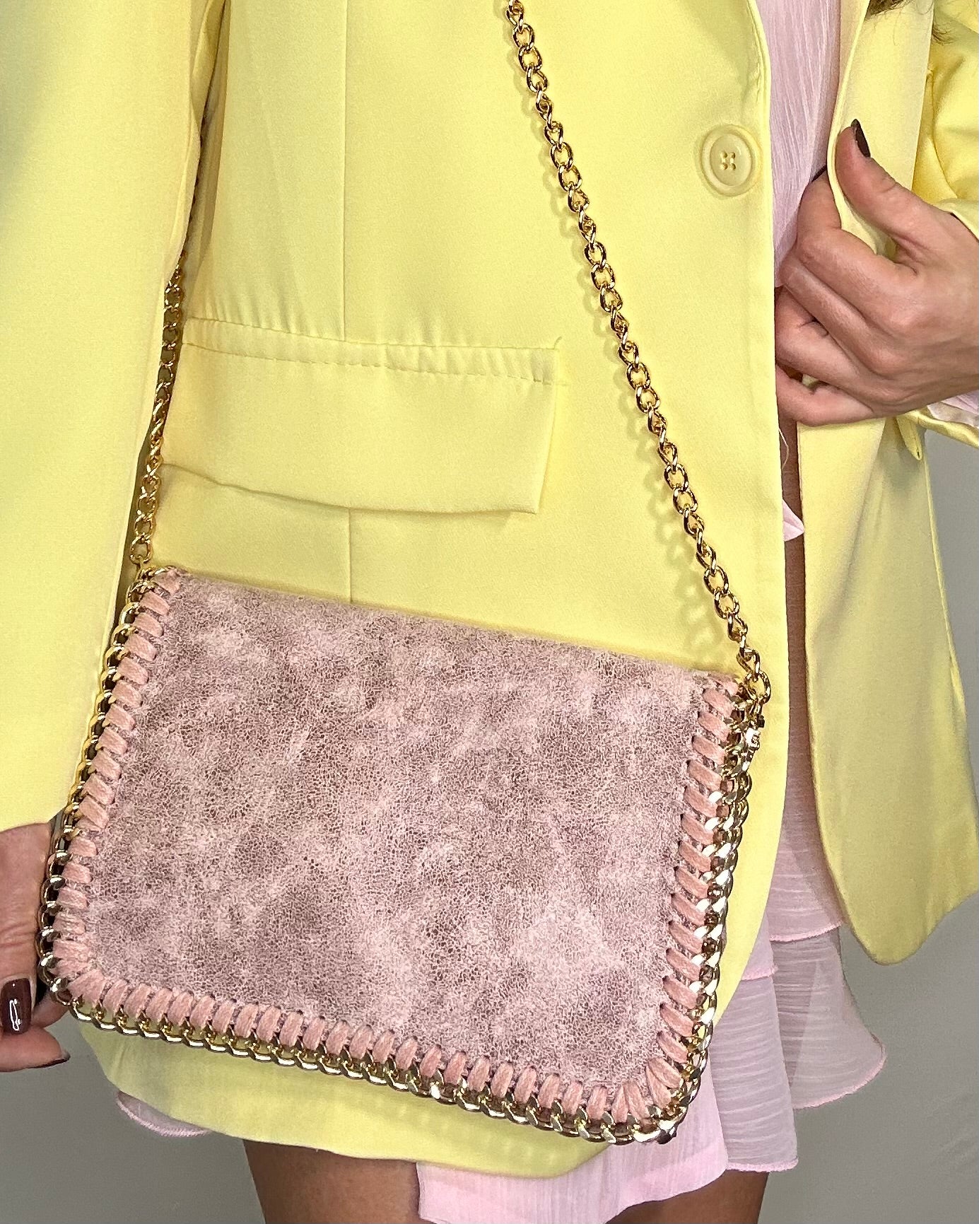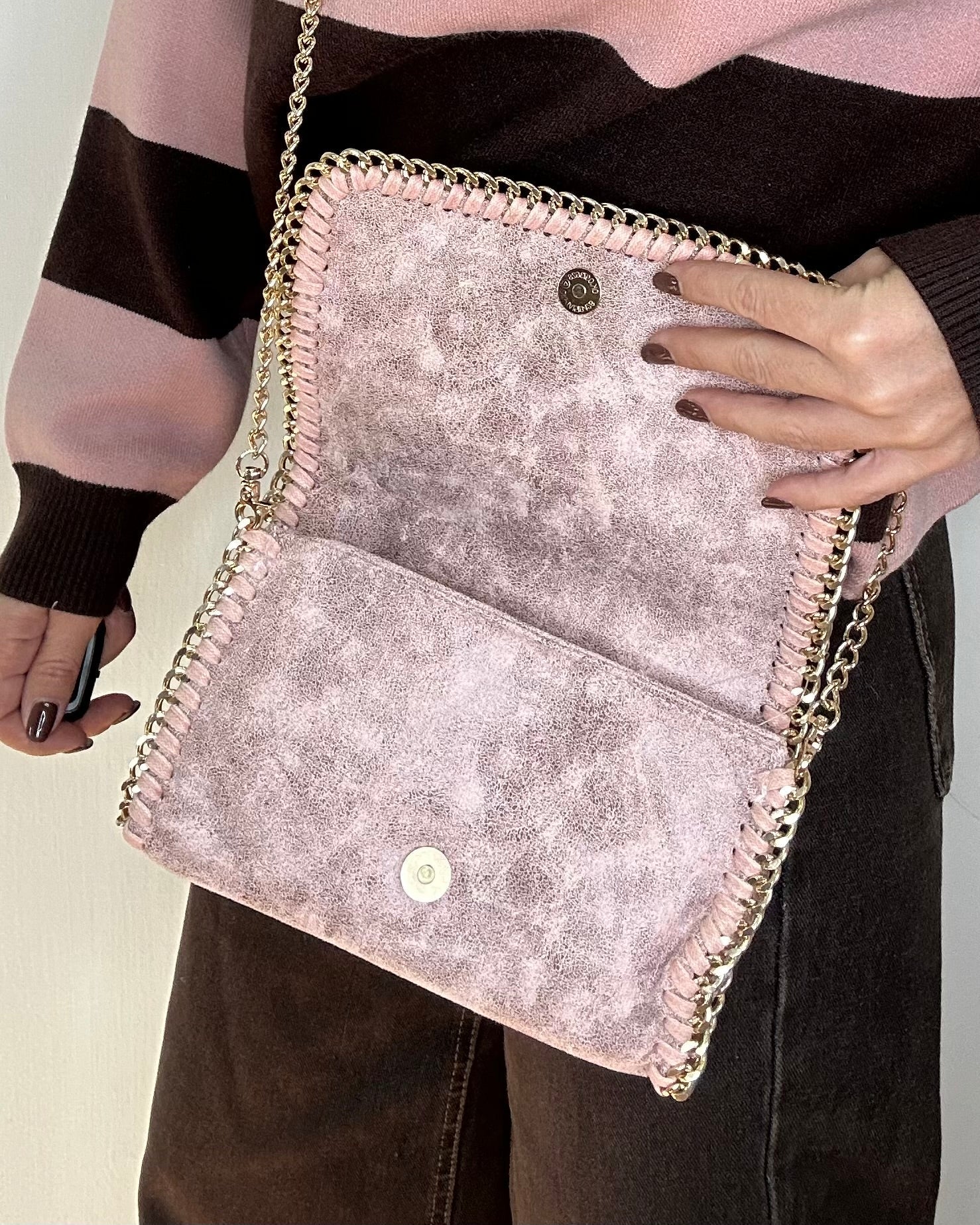 Borsa elegante in ecopelle bordeaux con lavorazione intrecciata sui bordi e catena dorata. Compatta e versatile, perfetta da portare sia a spalla che a tracolla per un tocco chic in ogni occasione.