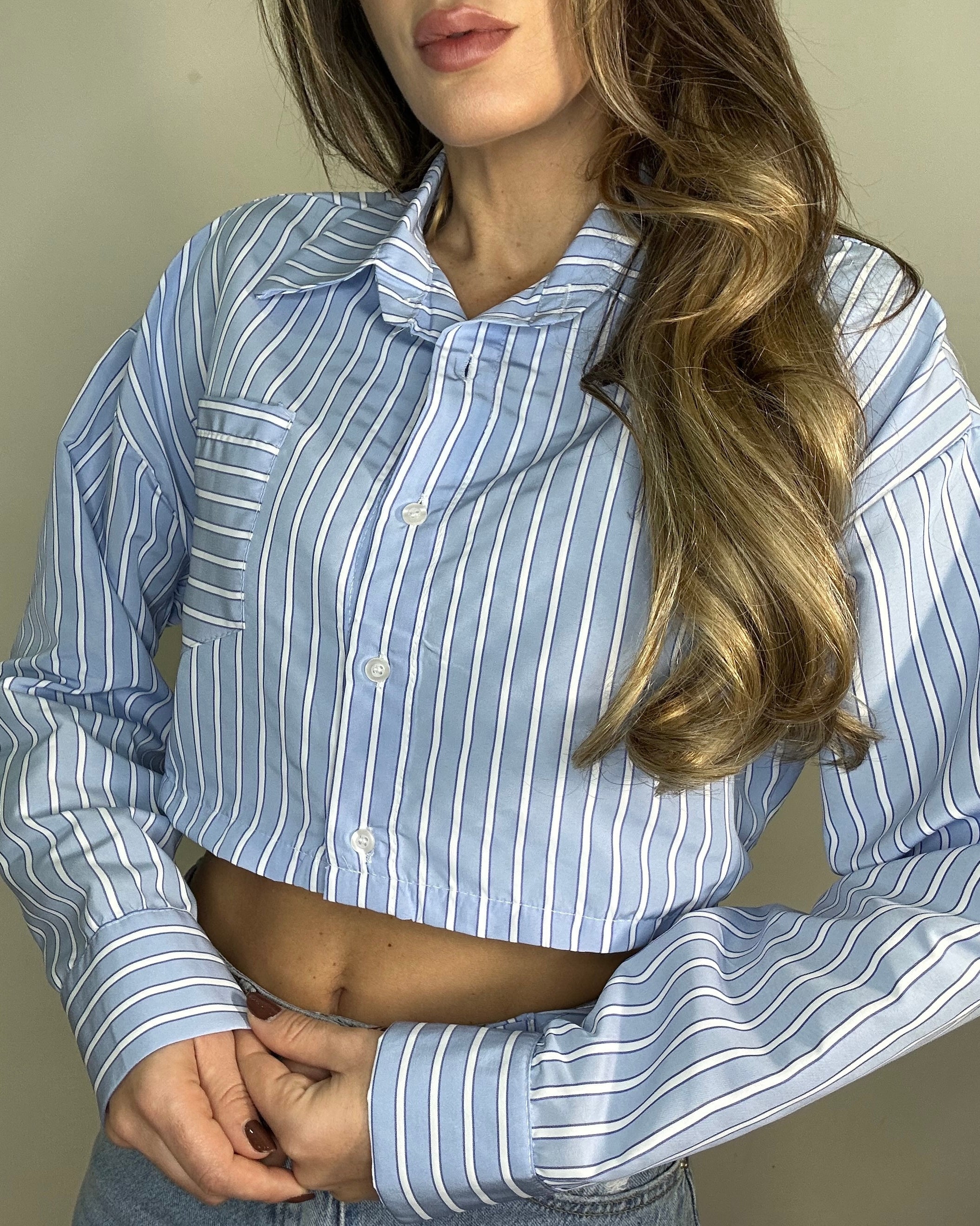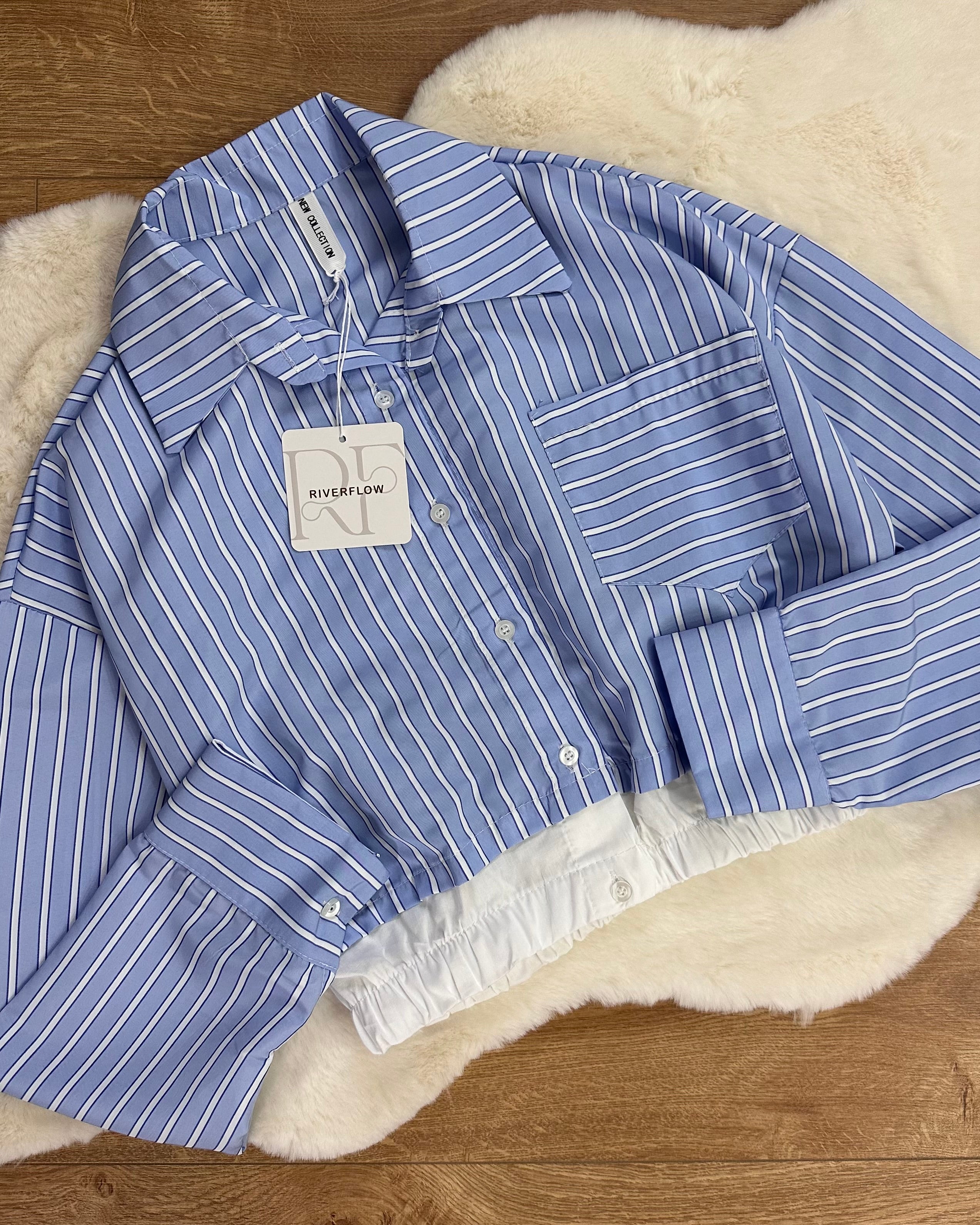 Camicia cropped a righe azzurre e bianche, super versatile e perfetta per look casual ma curati. Modello con colletto classico, taschino frontale e chiusura con bottoni. Sul fondo presenta una fascia elasticizzata che valorizza il punto vita e la rende comodissima da indossare.