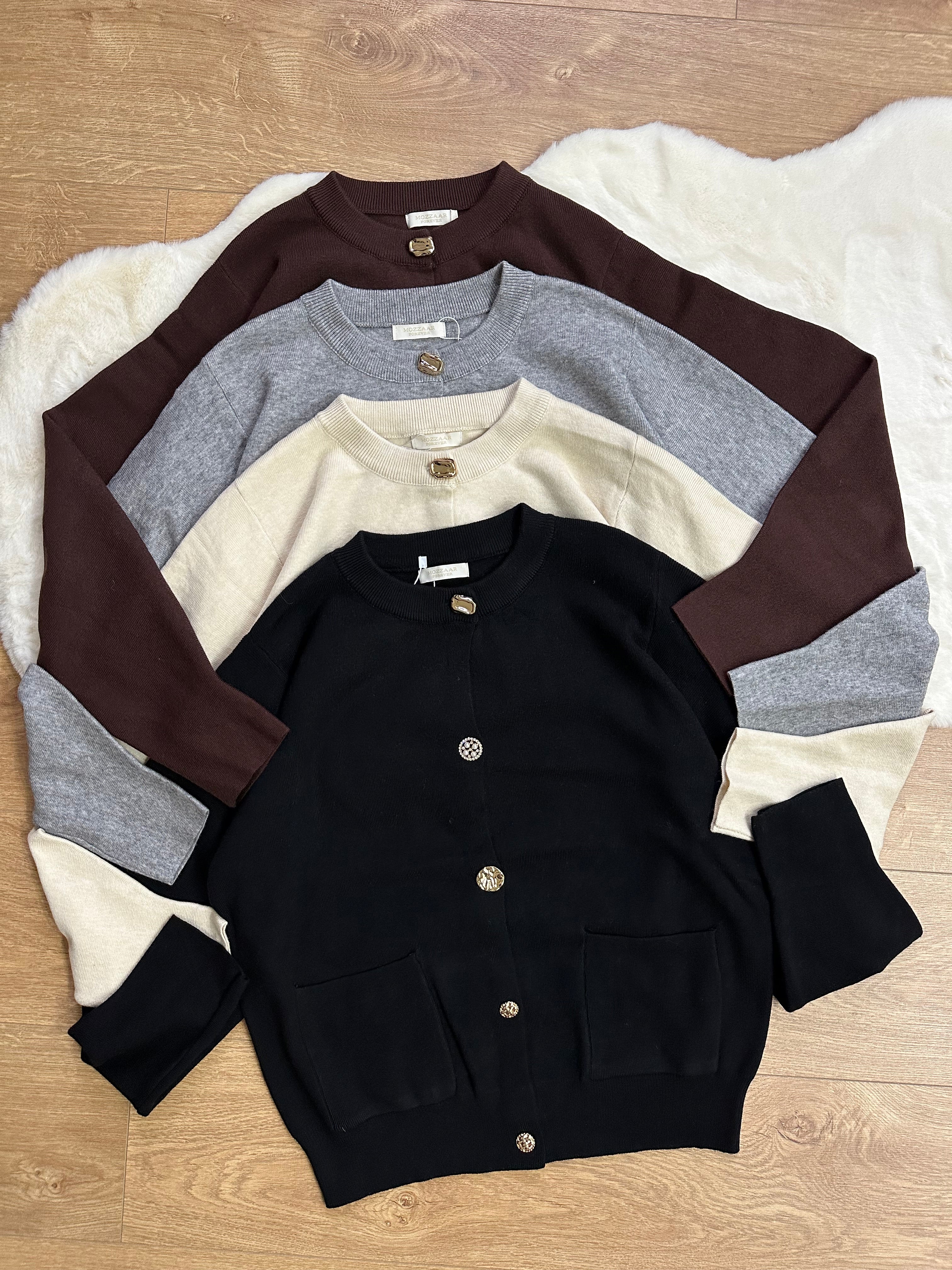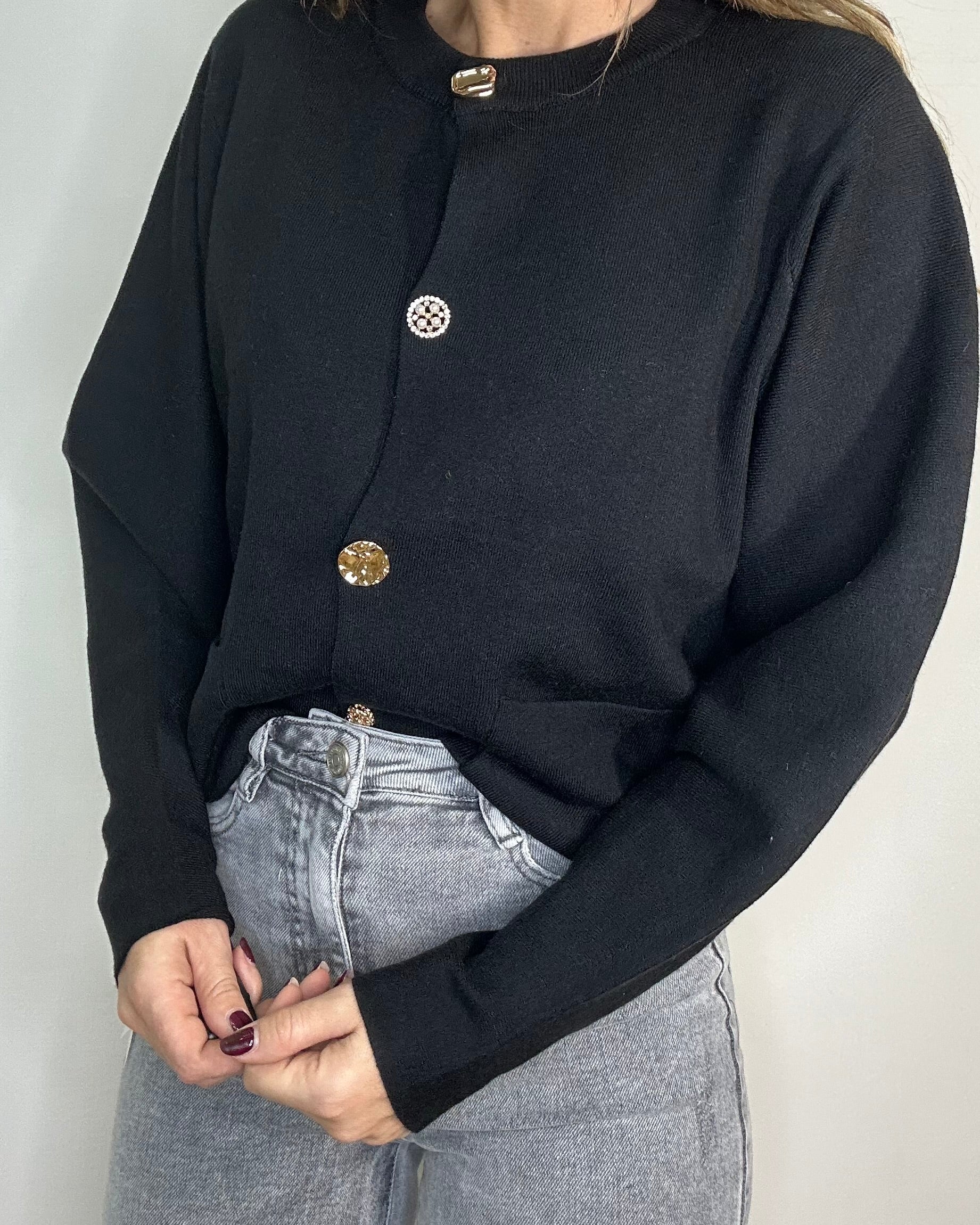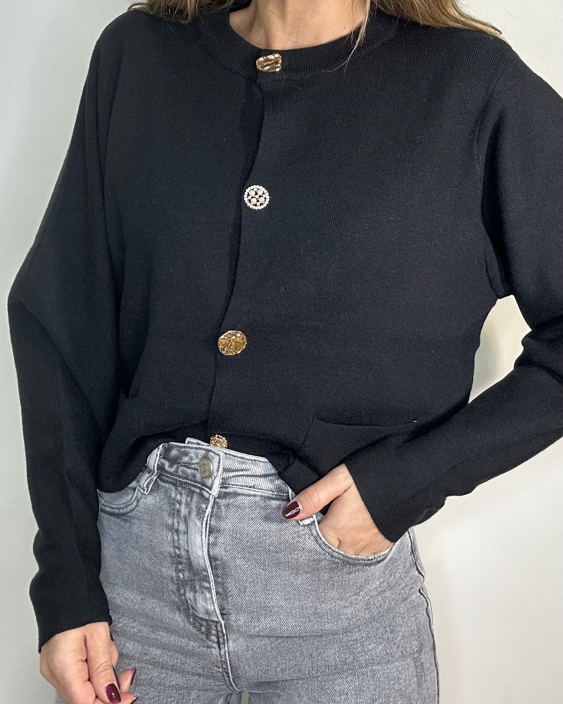 Cardigan caldo e morbidissimo, dal design minimal e super elegante. Impreziosito da bottoni gioiello che illuminano il look e da tasche frontali che lo rendono pratico e sofisticato. Un capo versatile, perfetto da indossare su outfit casual o più ricercati. lunghezza regolare elasticizzato taglia unica