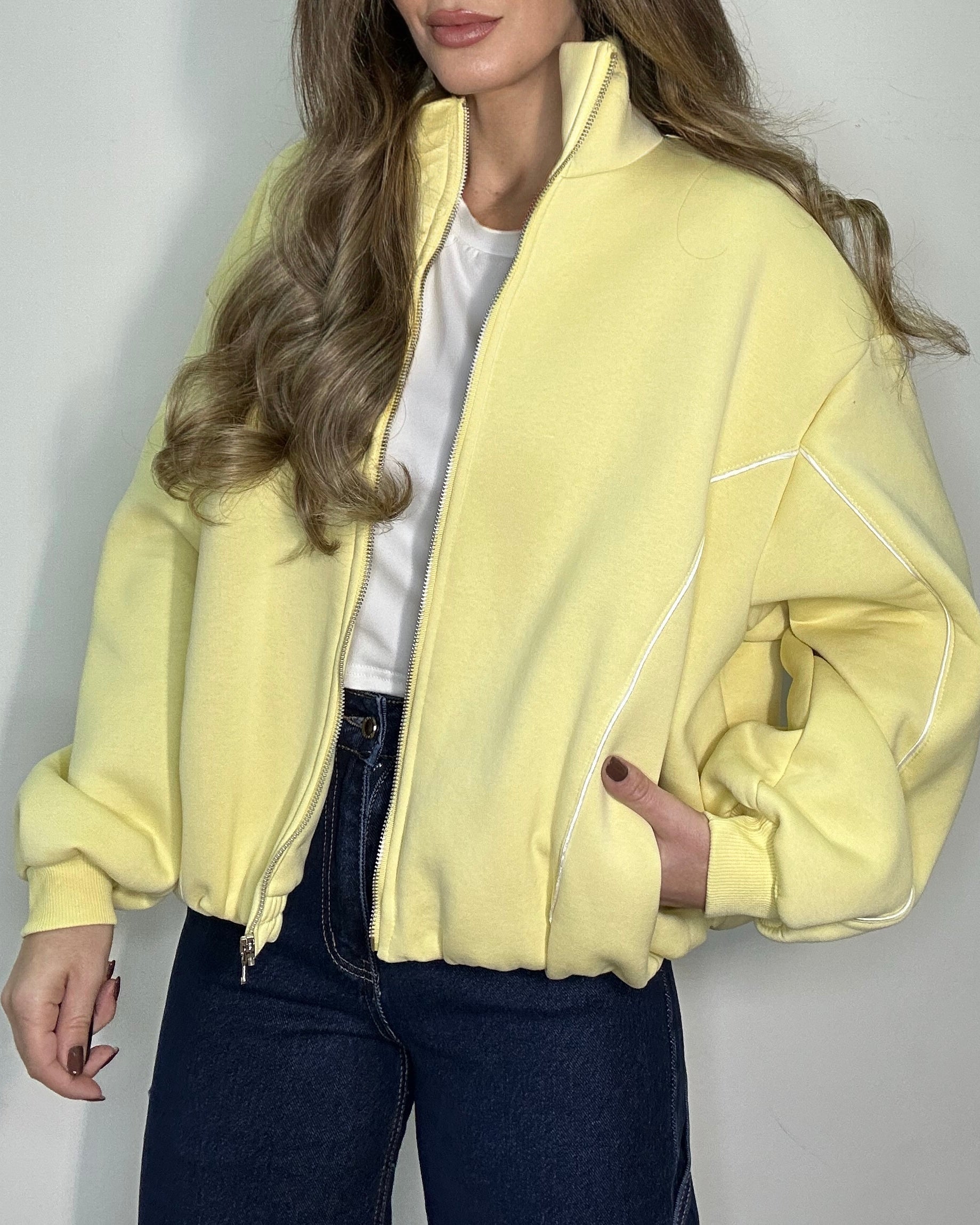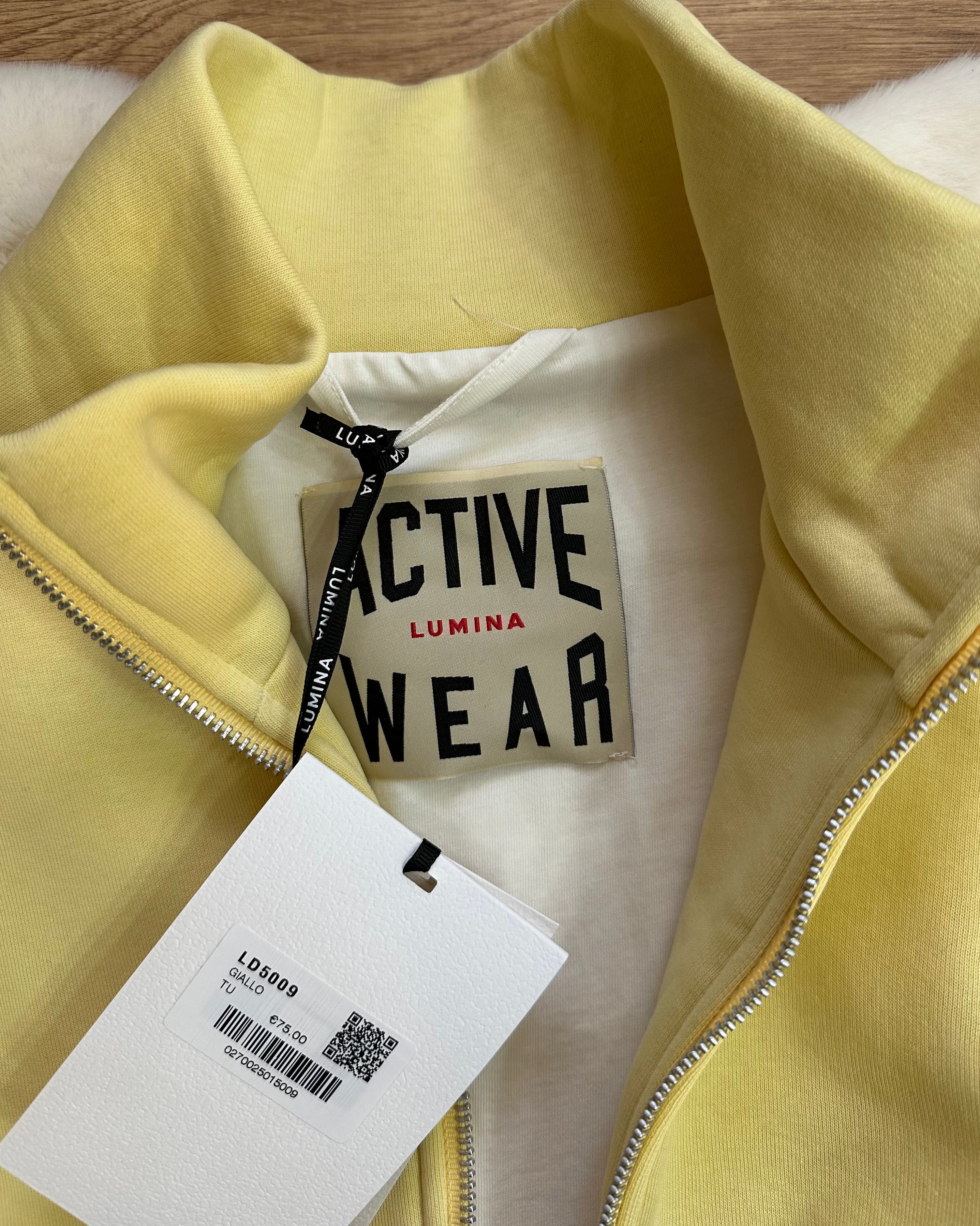 Felpa Lumina modello bomber con zip frontale e collo alto, super comoda ma anche molto curata grazie ai dettagli a contrasto che valorizzano la linea.