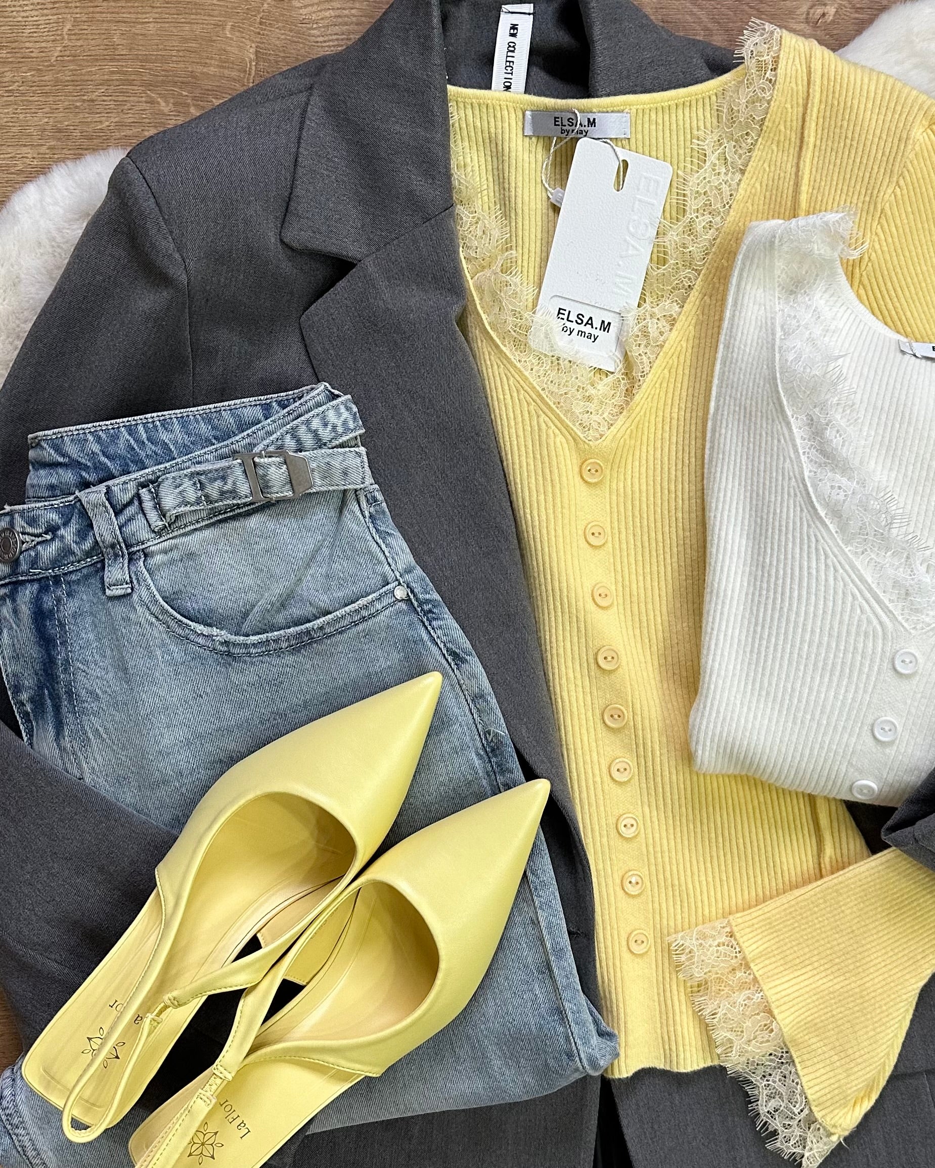Maglia Paris a costine con inserti in pizzo gialla e bianca