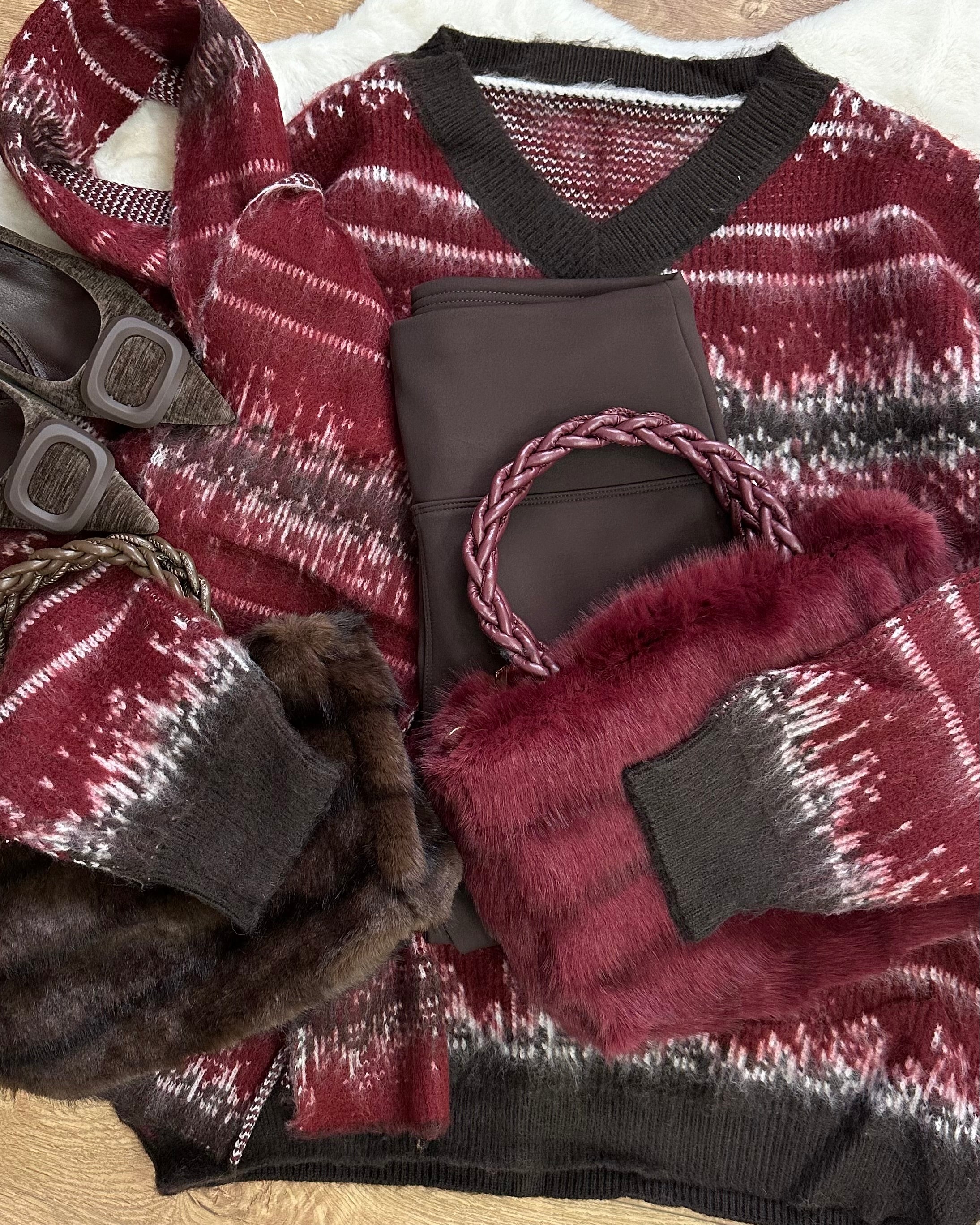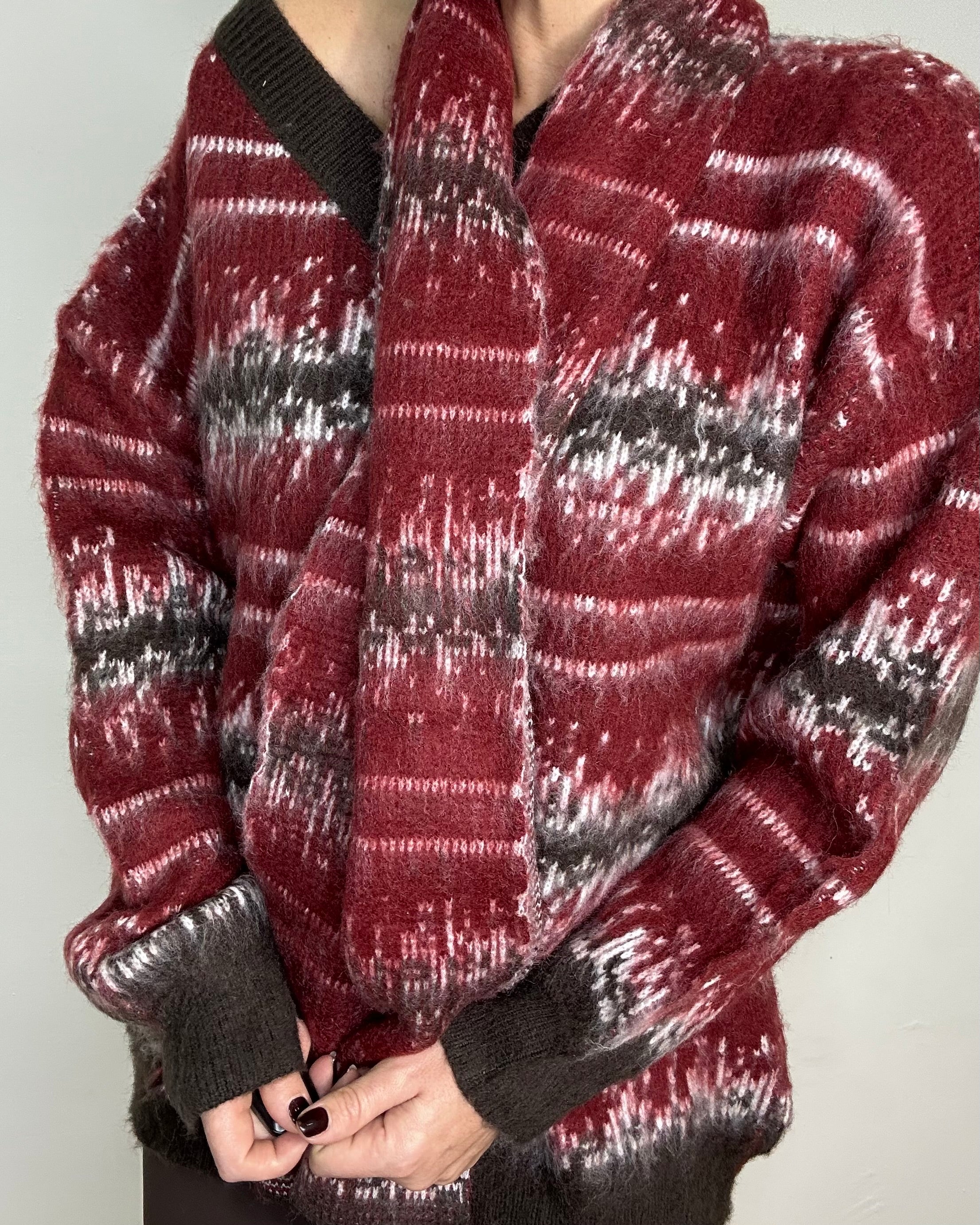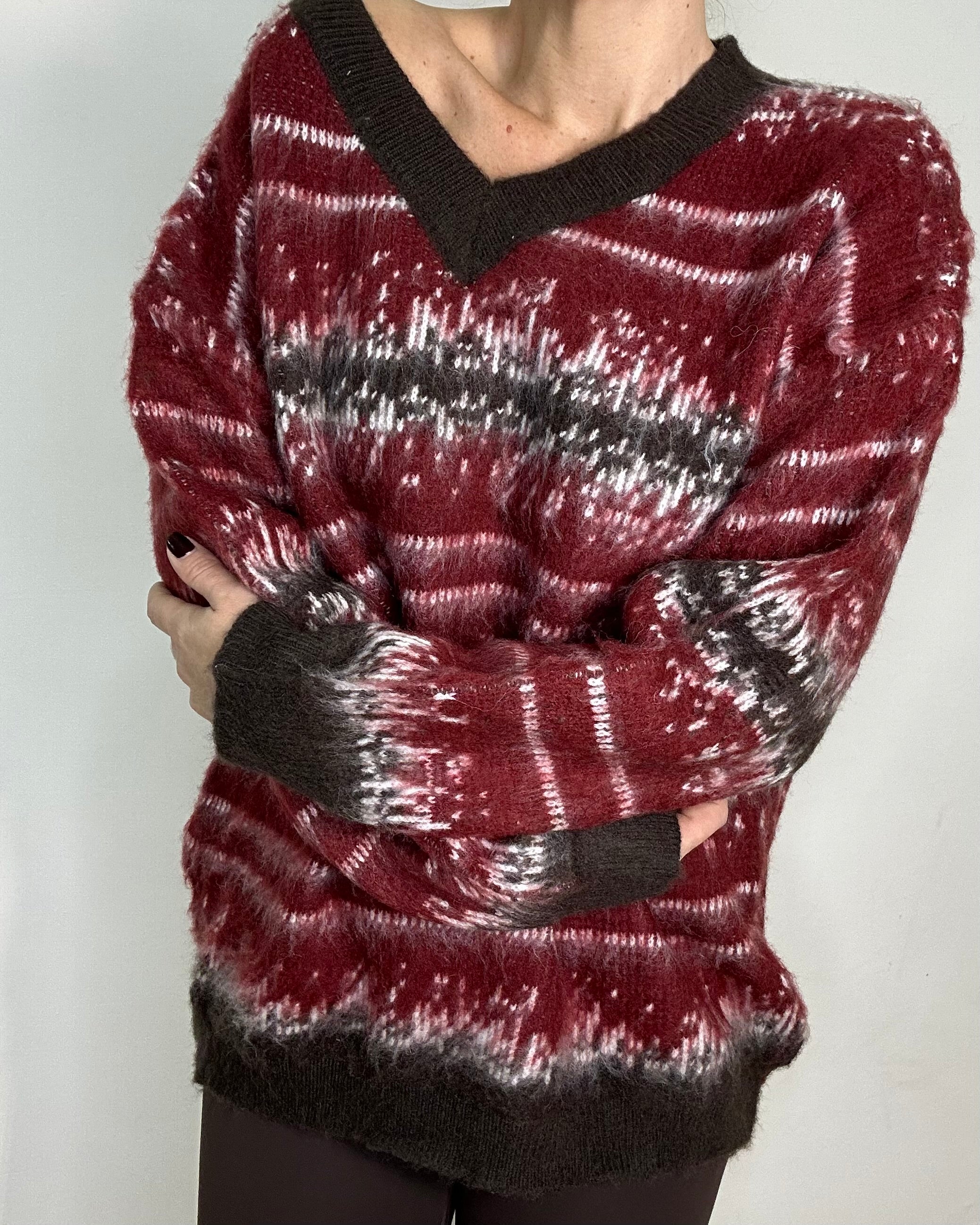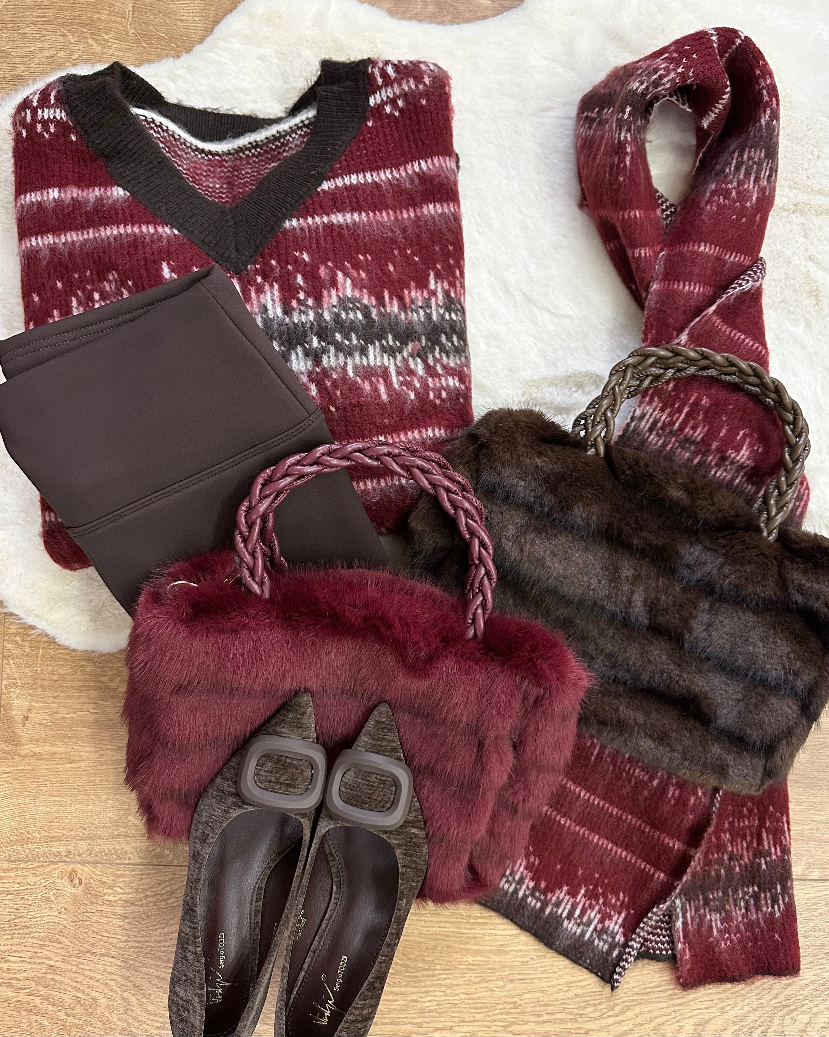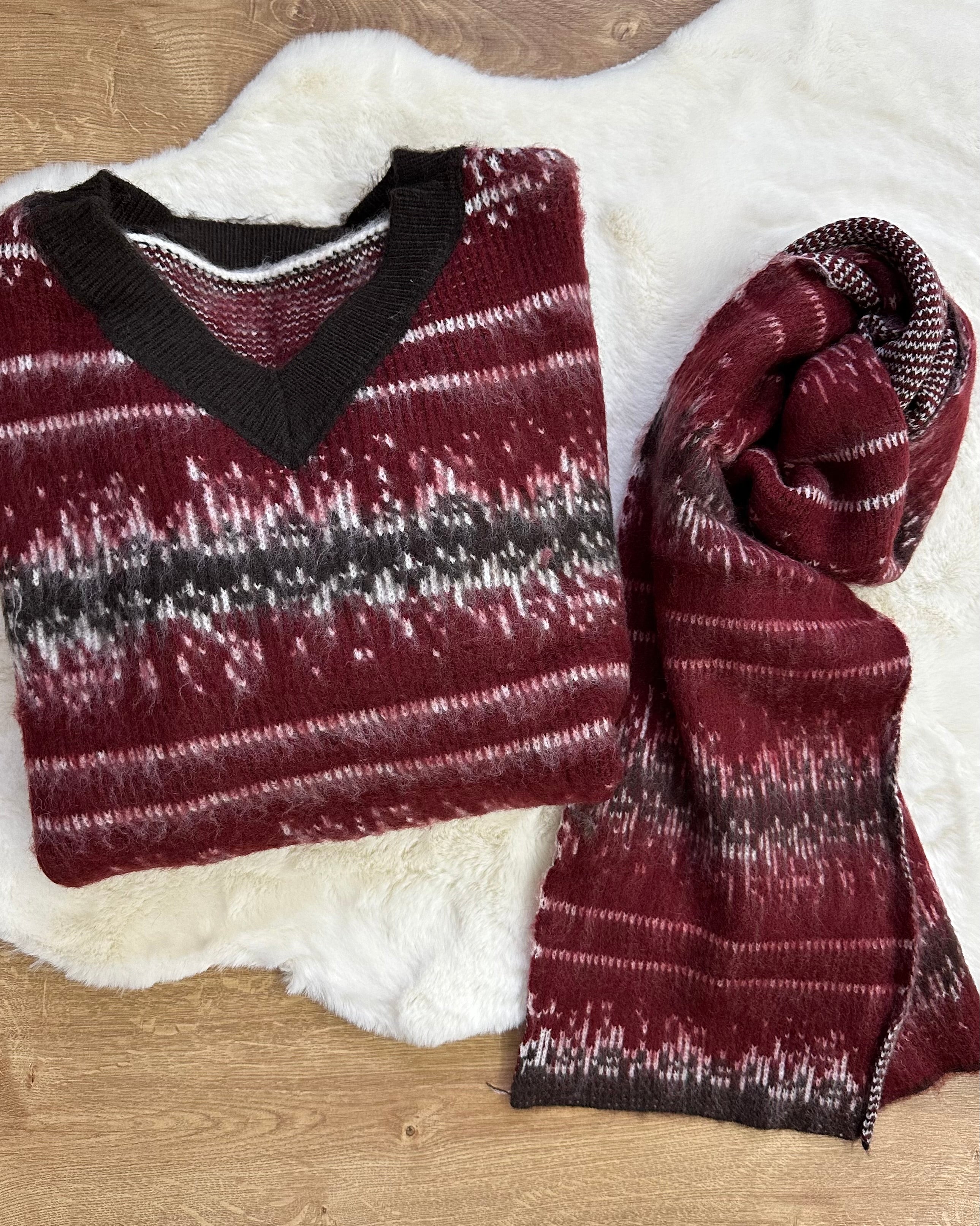 Maxi pull con lavorazione sfumata nei toni del rosso, bianco e marrone, impreziosito da bordo in contrasto su scollo, polsini e fondo. Incluso nel set trovi la sciarpa abbinata per un look caldo, chic e super completo.