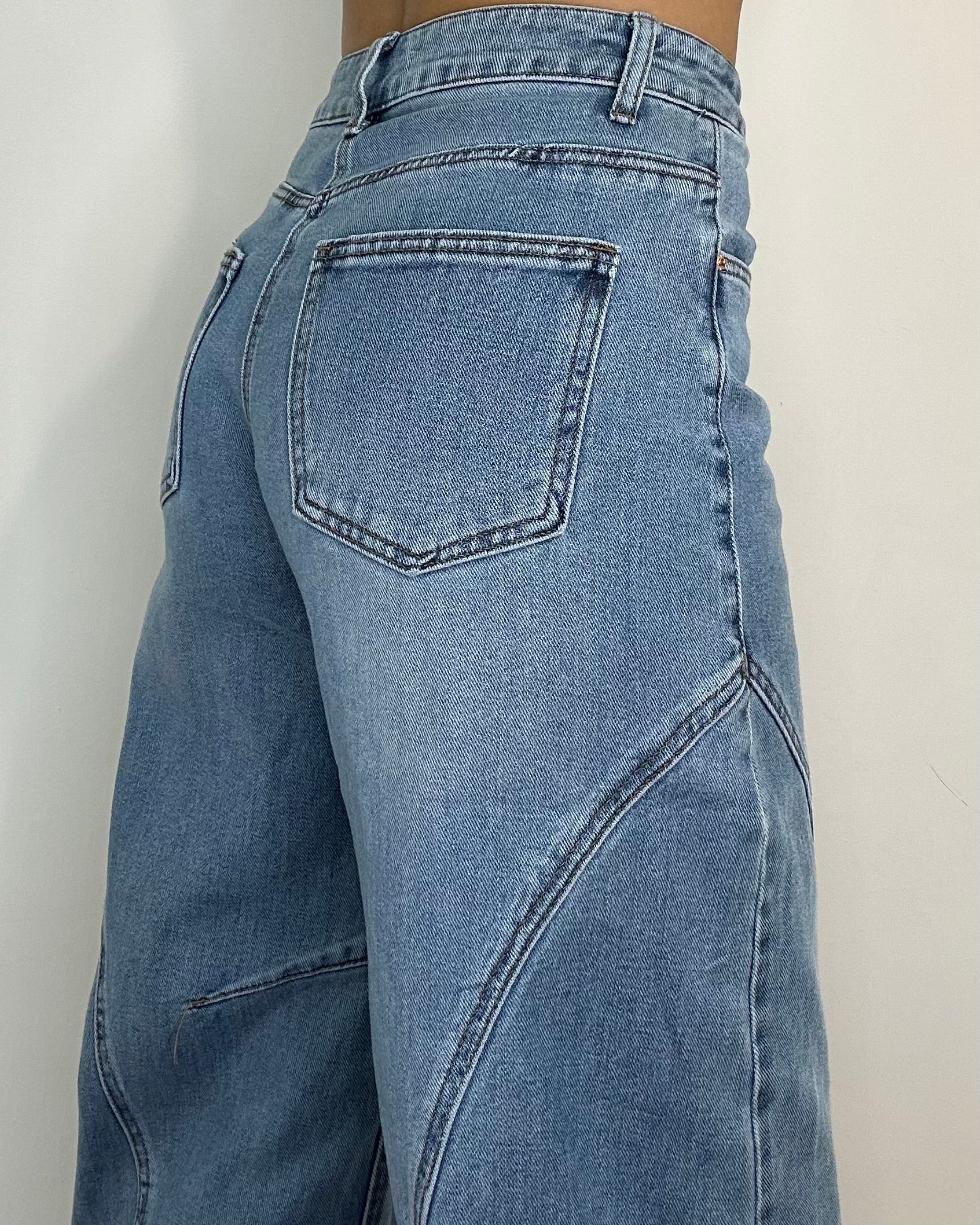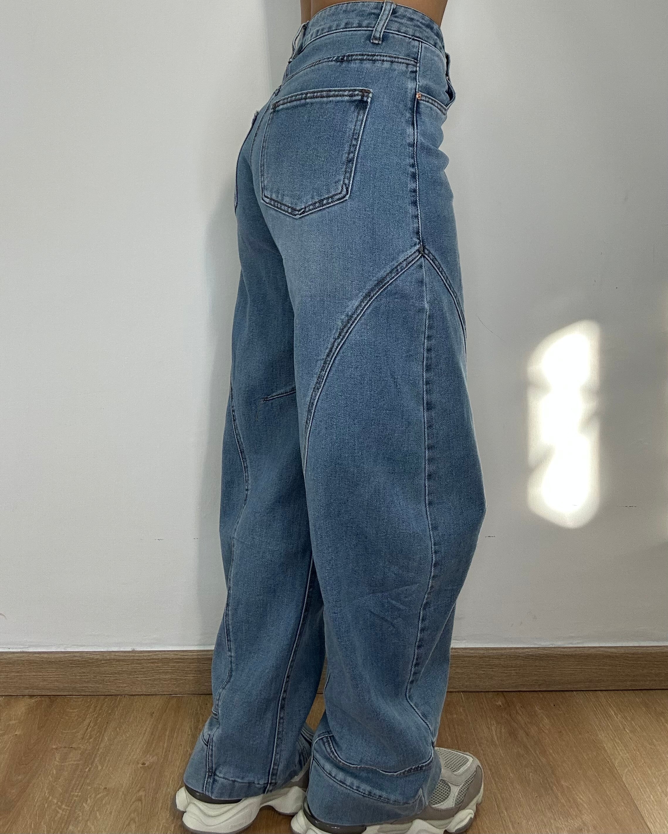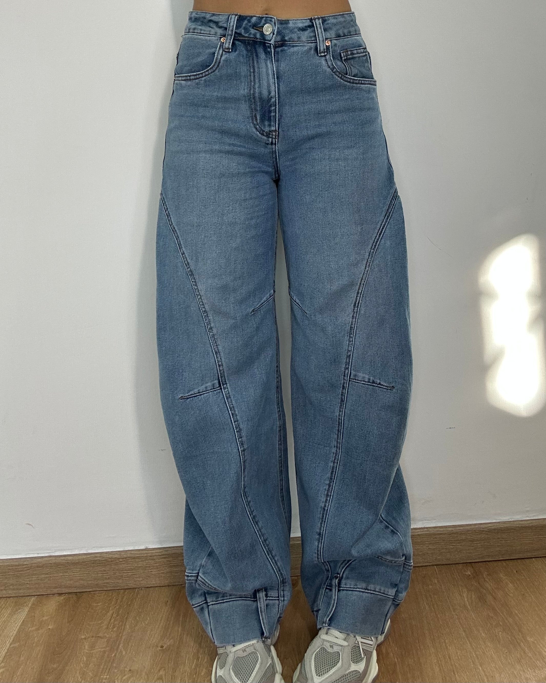 Jeans baggy, vita alta con gamba morbida, leggermente elasticizzato vestibilità regolare per taglia. La particolarità è tutta al fondo: passanti e finte tasche sulla caviglia che creano un effetto cargo super trendy. Lavaggio chiaro vintage. Perfetti con felpe e sneakers.