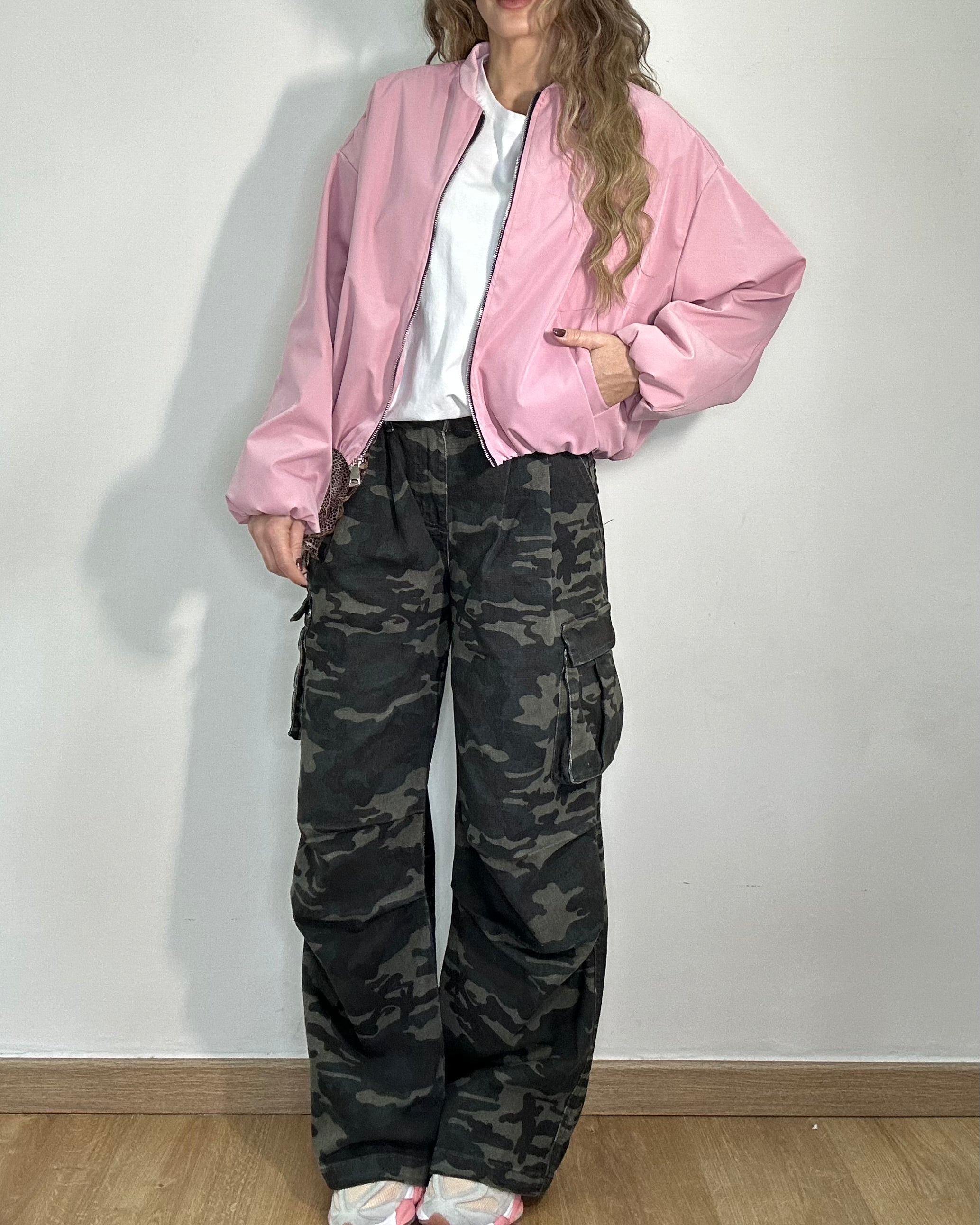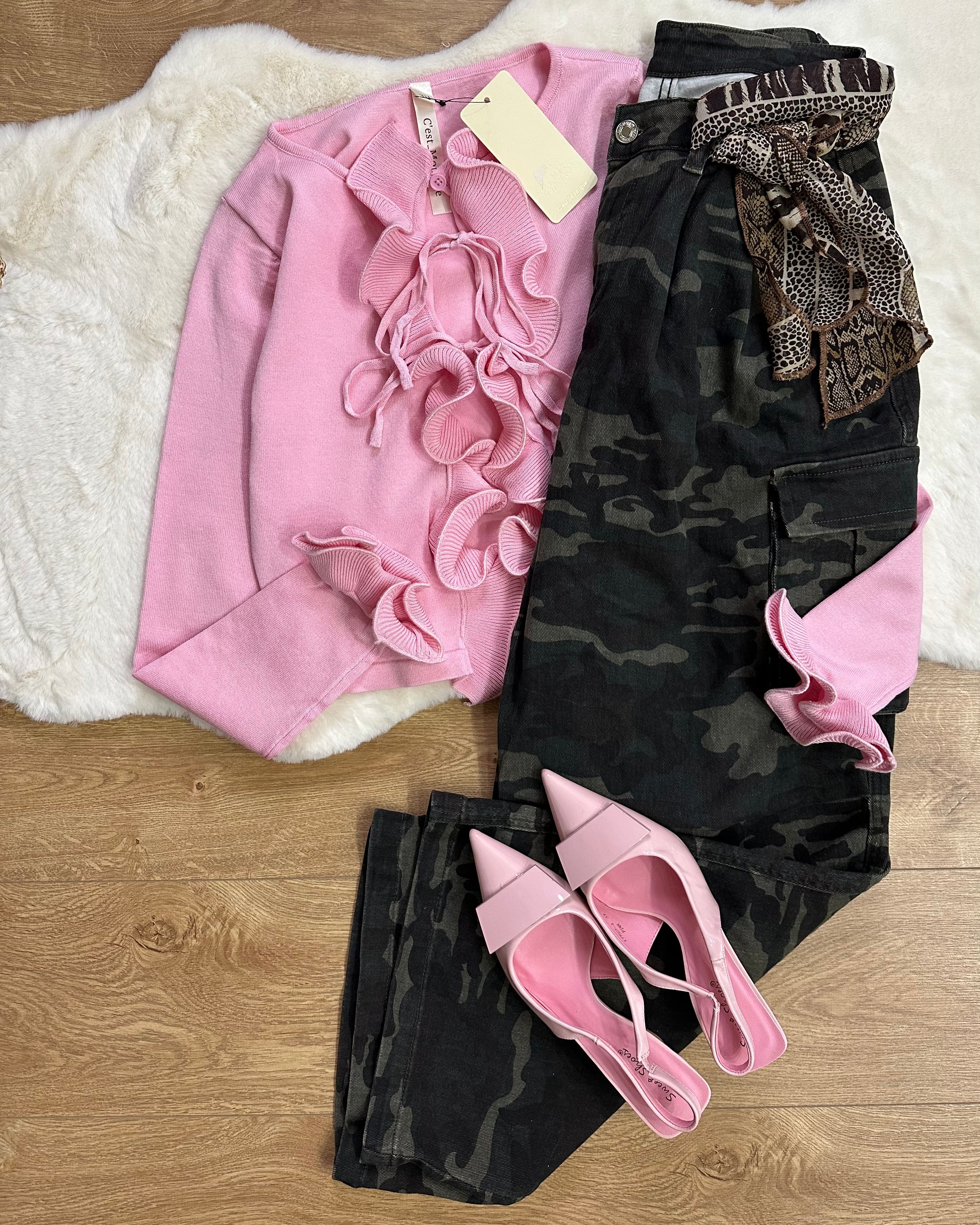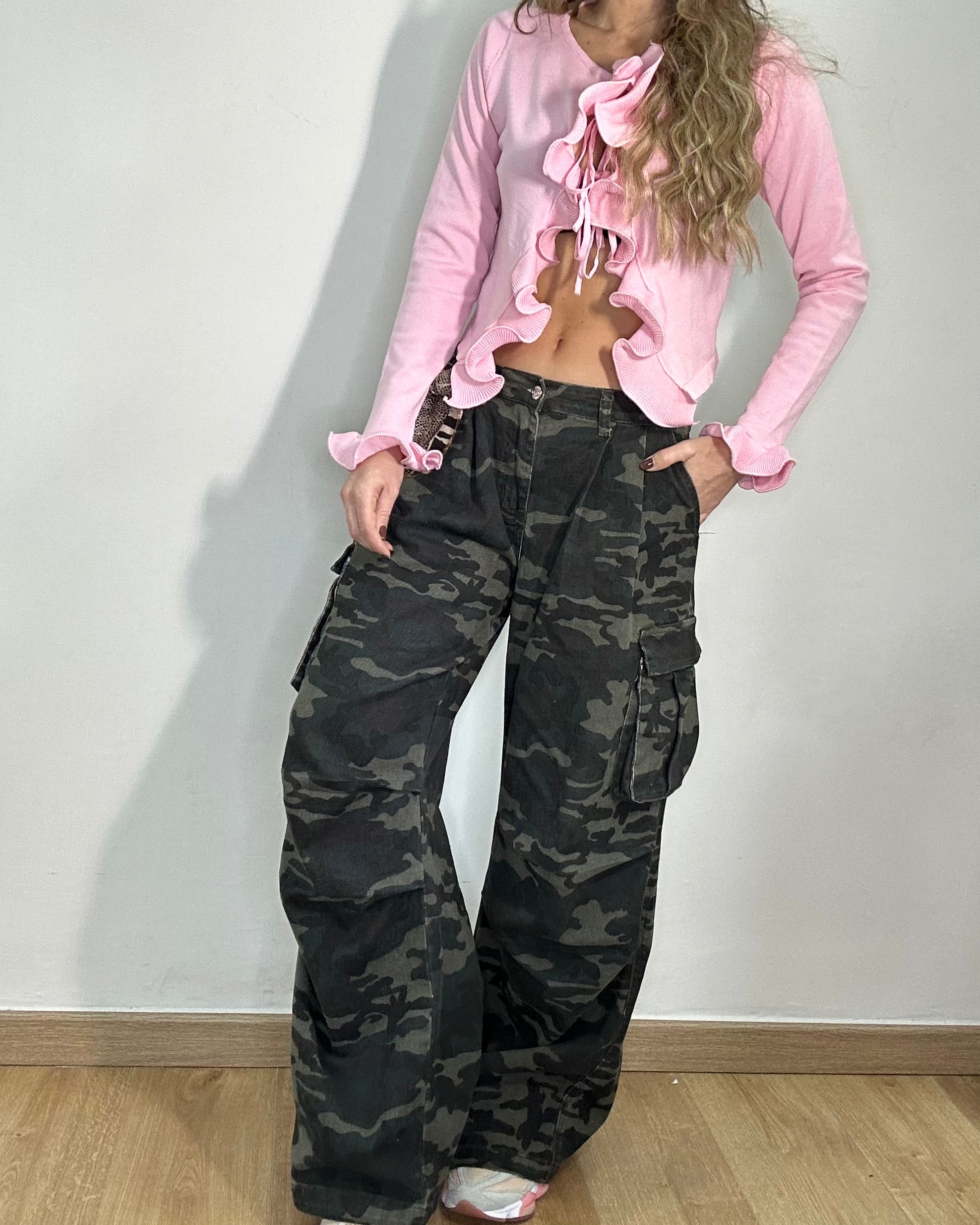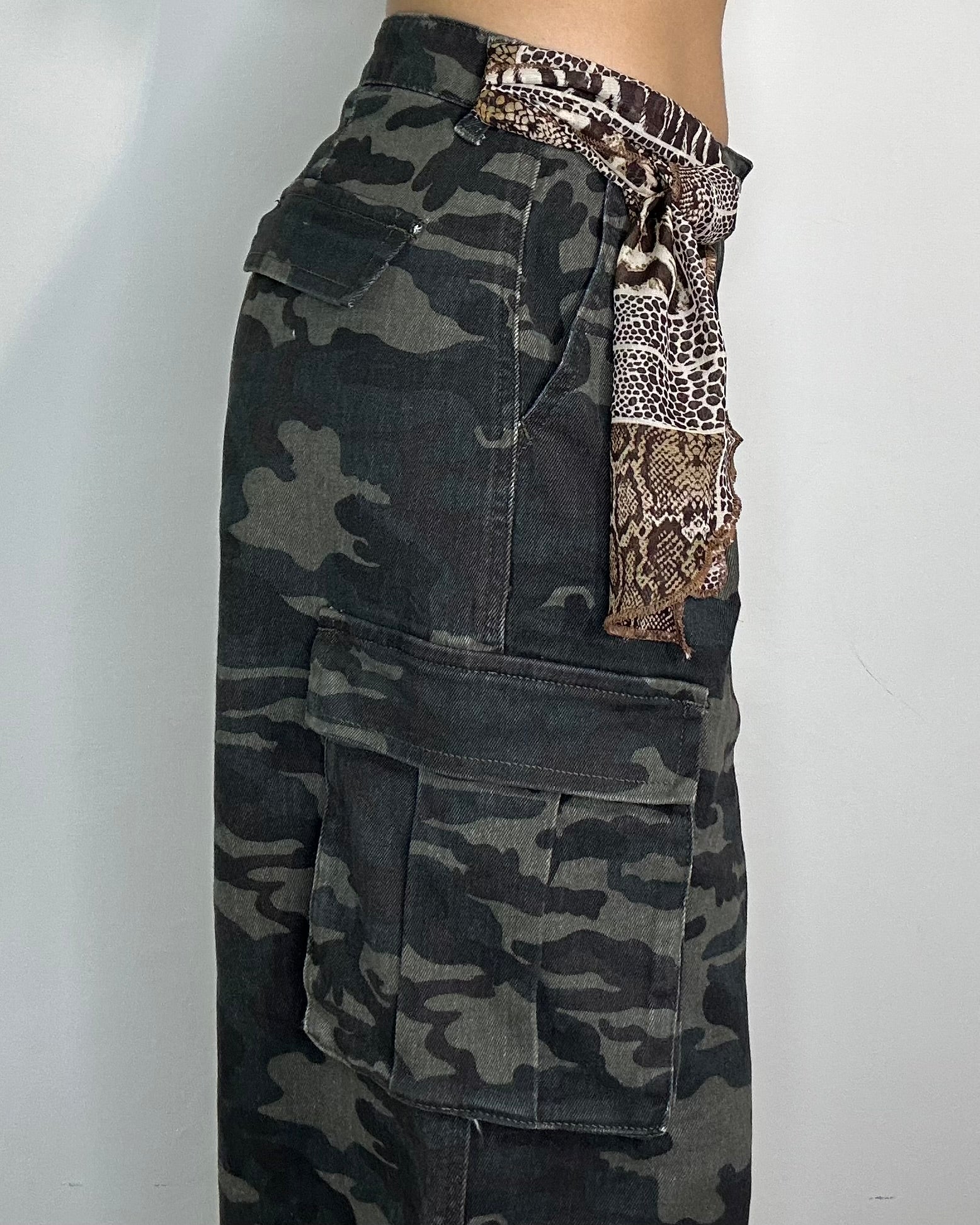Jeans cargo dal carattere deciso e urban, realizzato in denim con fantasia mimetica. Un capo statement che unisce stile militare e femminilità, perfetto per creare look strong ma curati.