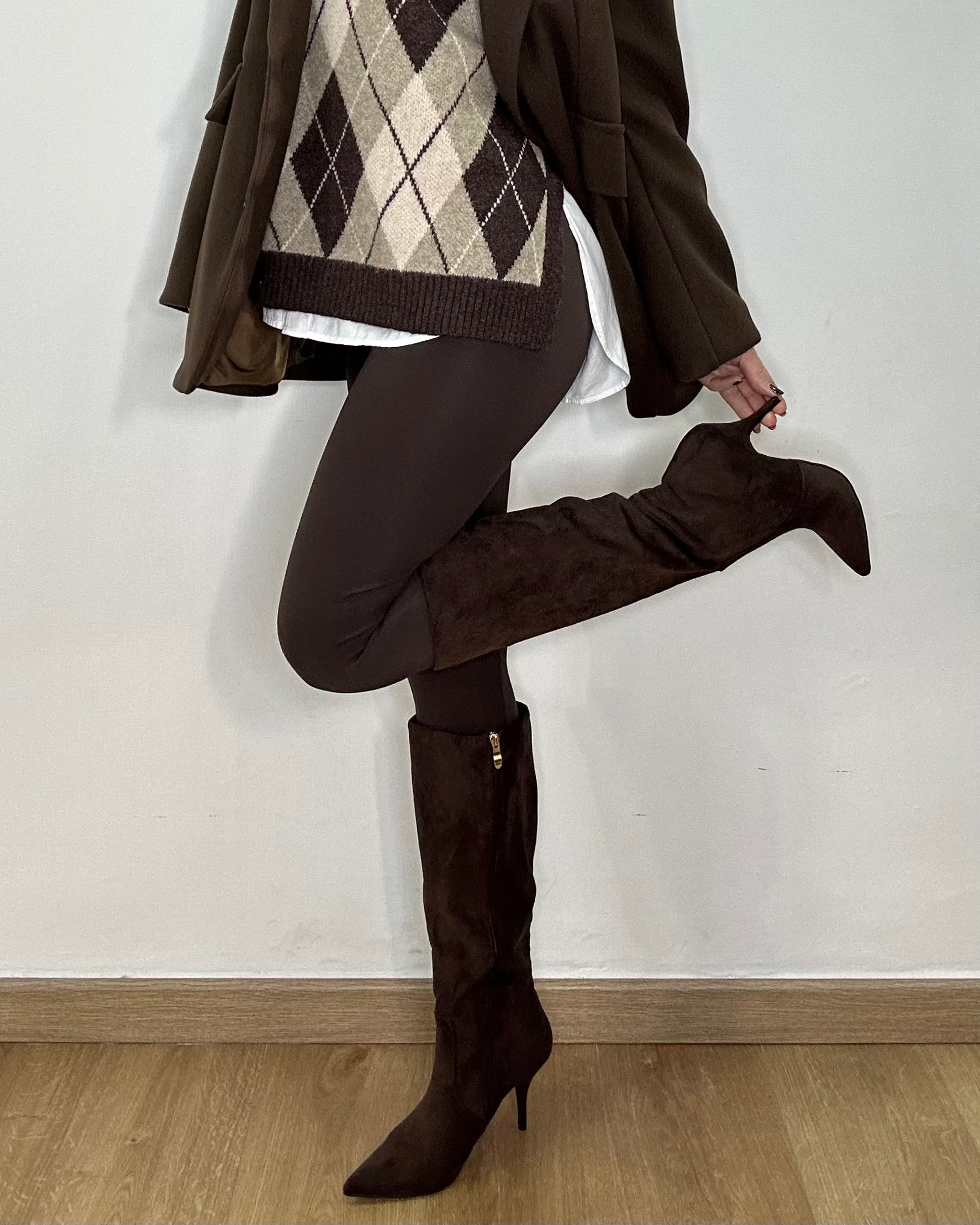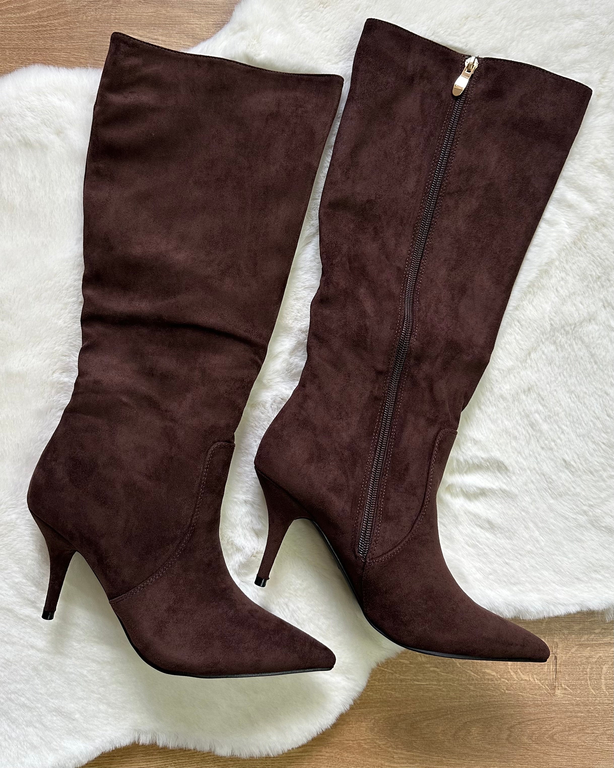 Stivali in morbido effetto suede con tacco comodo e punta affusolata. Eleganti e versatili, perfetti da abbinare a jeans, gonne o mini-dress per un look chic ma super pratico.