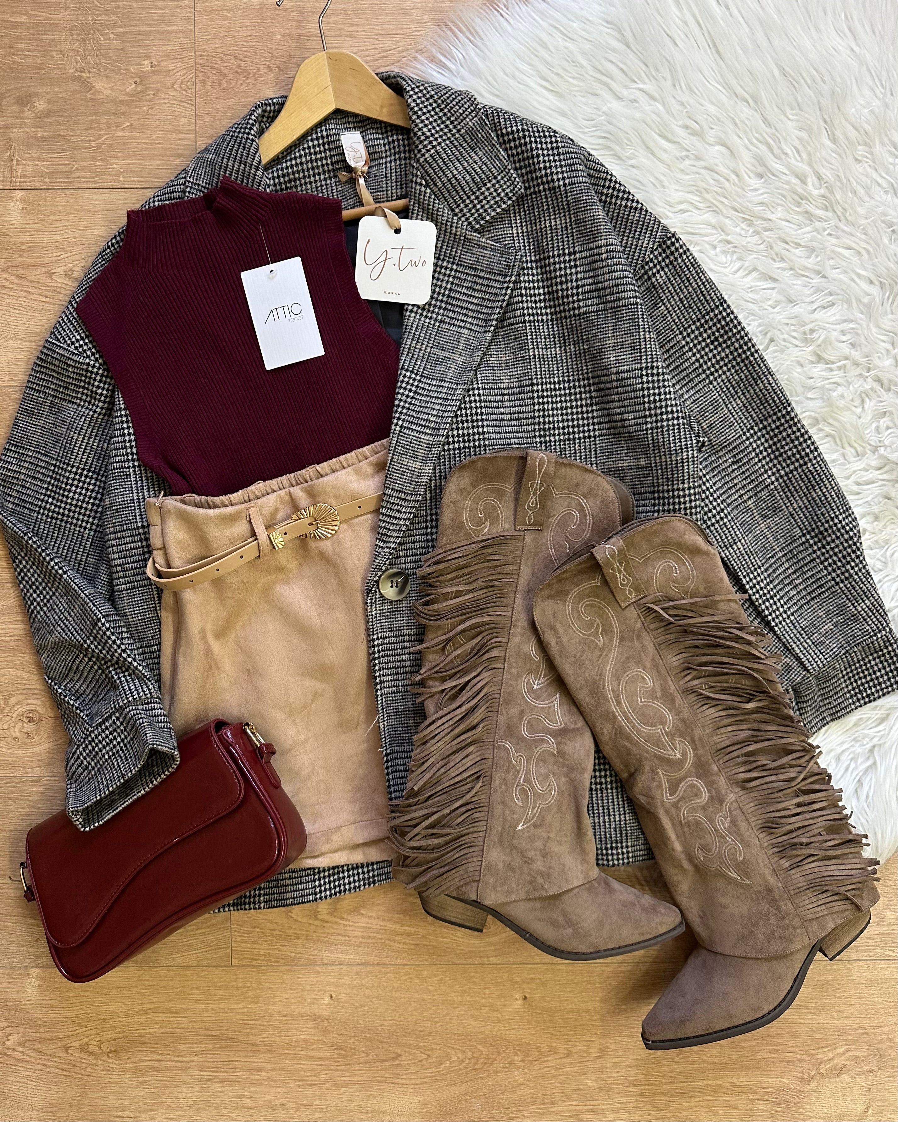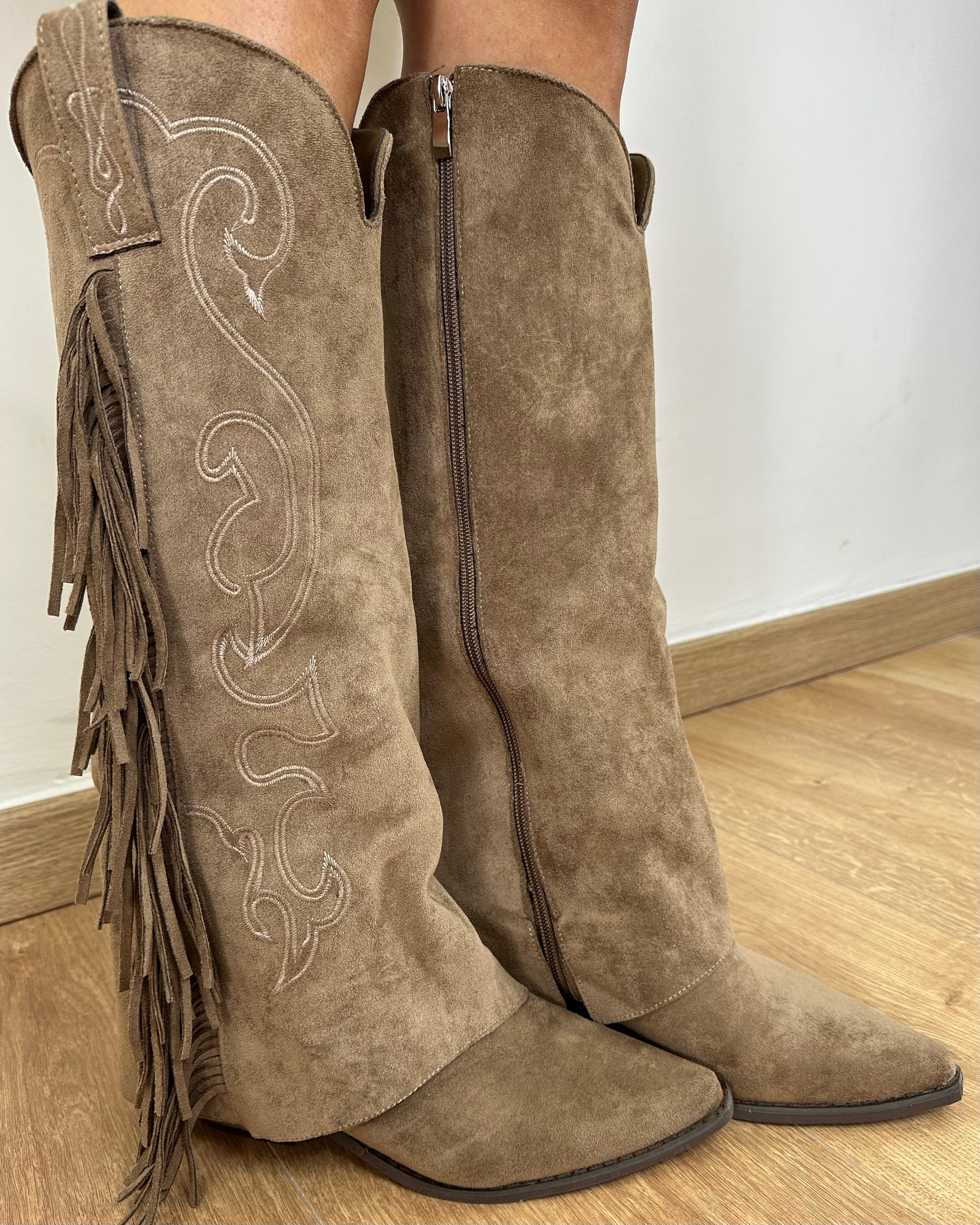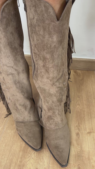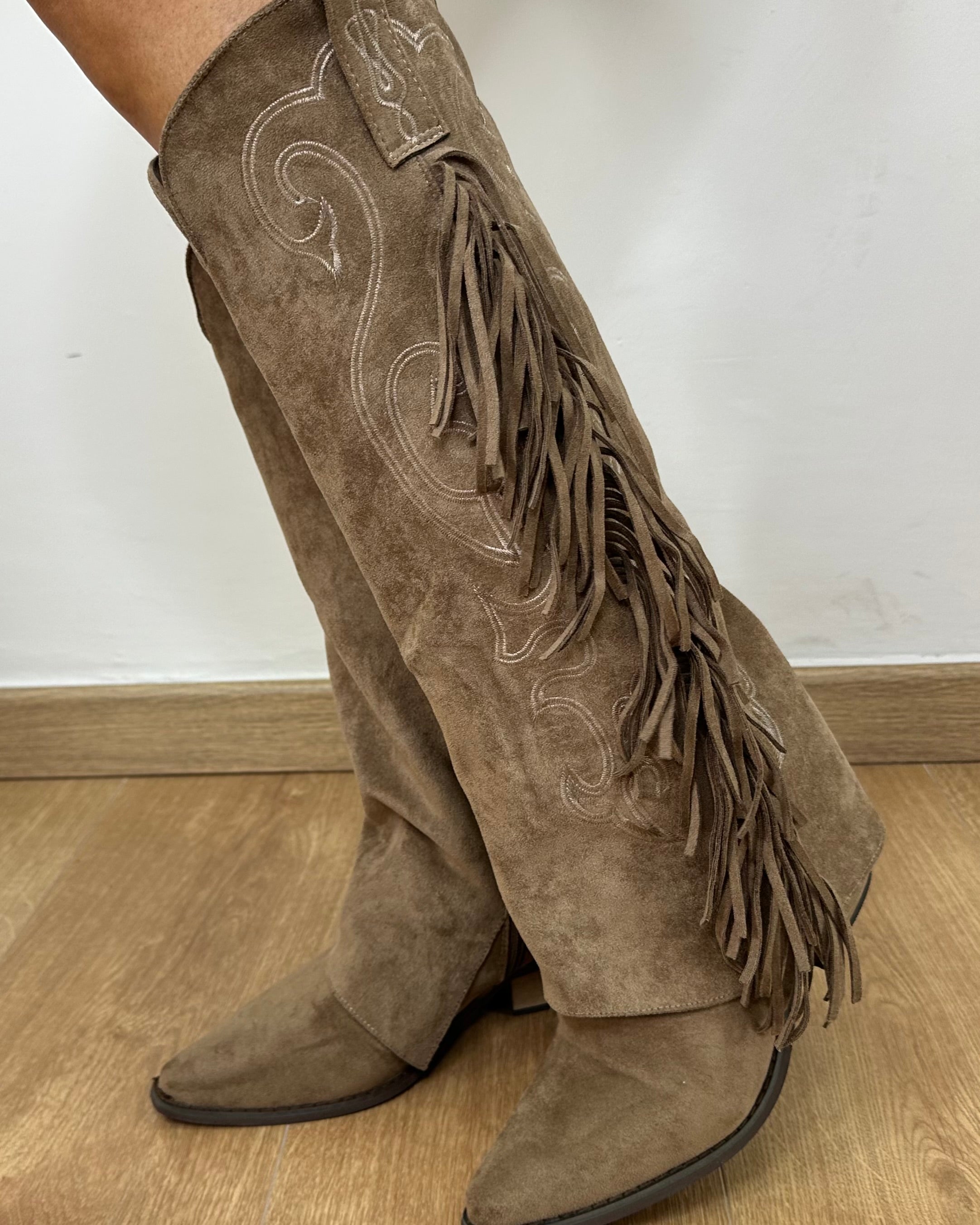 Stivali alti in camoscio con ricami western e frange laterali, dal carattere grintoso e super trendy. Perfetti per completare i tuoi look casual chic o country glam.